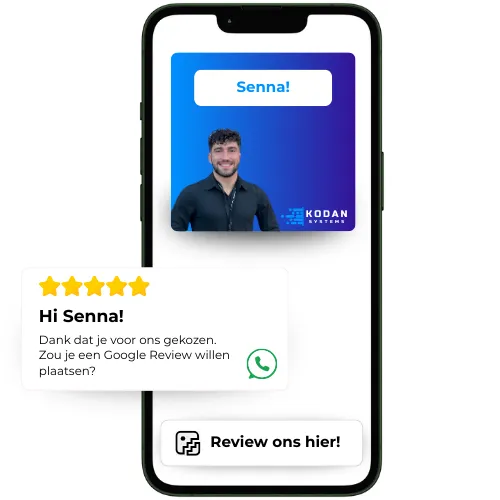 Stop met achter klanten aanzitten voor reviews. Met Kodan Review vraag je automatisch om reviews via WhatsApp & e-mail, reageert onze AI direct namens jou én deel je positieve ervaringen op social media.